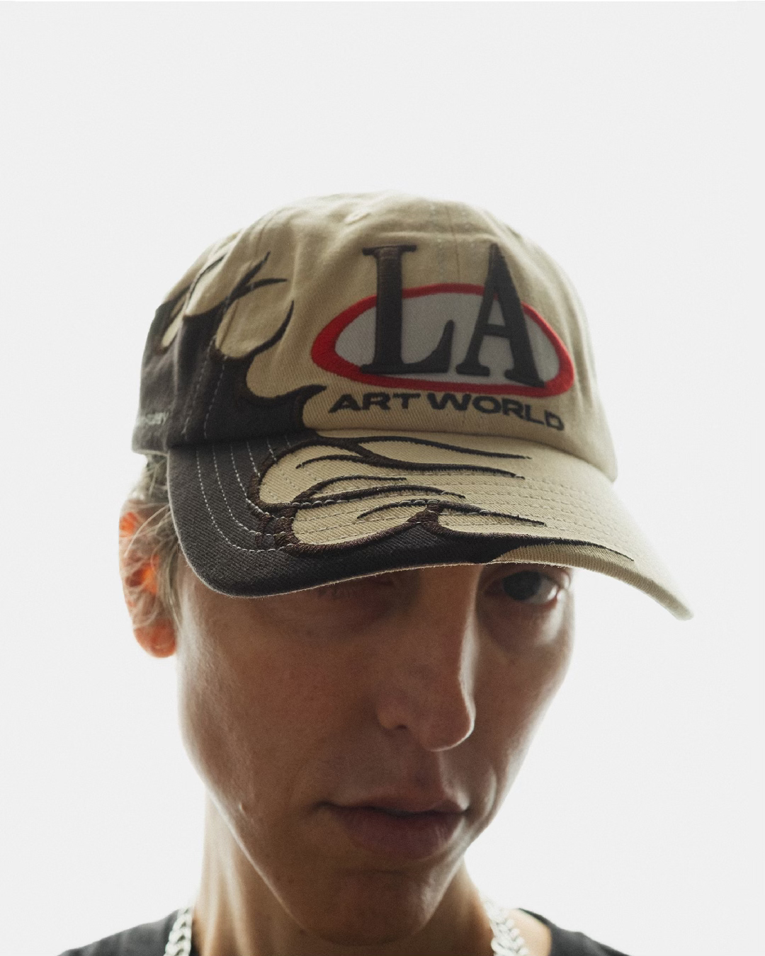 - Flame pattern embroidered in satin extends from the visor to the rear, juxtaposed against a contrasting fabric color.